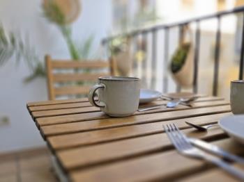 Balcón privadocon mesa y sillas, perfecto para desayunar al sol o relajarte al atardecer.